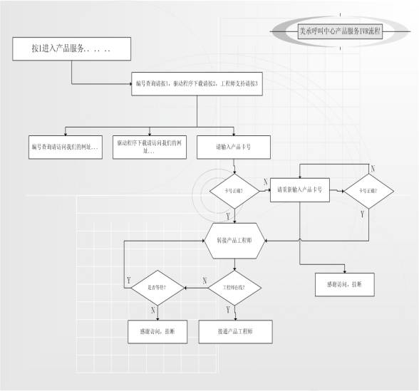 IVR系統(tǒng)是呼叫中心系統(tǒng)中極為重要的一環(huán)。作為面向用戶的窗口,IVR的語音交互方式引導用戶進入不同的業(yè)務(wù)流程,聽取相關(guān)信息。清晰,流暢,禮貌而又有層次的IVR語音會給用戶留下深刻的印象。美承的IVR系統(tǒng)在設(shè)計上參照了其他成功的客服中心的經(jīng)驗,充分考慮了用戶的習慣,在流程上具有鮮明的特點,以下以產(chǎn)品服務(wù)為例: