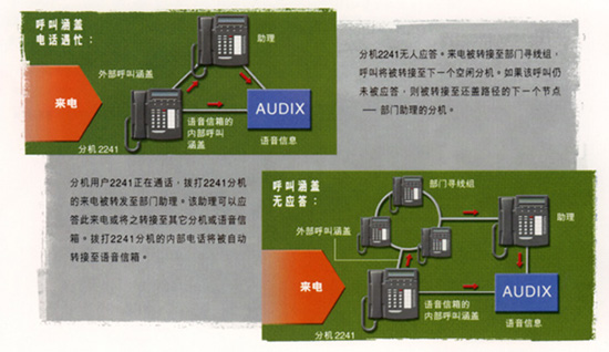 當最初的被叫方不能接聽來話時,呼叫涵蓋功能可將來話轉接到另外一個分機。您可以自行規(guī)定判斷是否轉接的標準以及涵蓋通道的條件,如無應答、 無此號碼、遇忙籌。DEFINITY BCS還可以識別內部和外部呼叫,并為其提供不同的涵蓋通道。