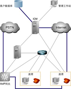 Cisco智能聯(lián)系管理軟件(ICM)可使企業(yè)通過Internet或PSTN并利用ACD、IVR、Web與電子郵件服務(wù)器、桌面應(yīng)用等與其客戶進(jìn)行交互;诰W(wǎng)絡(luò),ICM軟件可根據(jù)被叫號(hào)碼,主叫號(hào)碼,呼叫者輸入的數(shù)字,以Web形式提交的數(shù)據(jù),從客戶背景數(shù)據(jù)庫獲得的信息對(duì)每個(gè)客戶進(jìn)行區(qū)分。與此同時(shí),系統(tǒng)根據(jù)從聯(lián)絡(luò)中心平臺(tái)與座席桌面收集的實(shí)時(shí)狀態(tài)信息獲知哪些資源能夠用來滿足客戶的需求。具體的ICM系統(tǒng)組件如下。