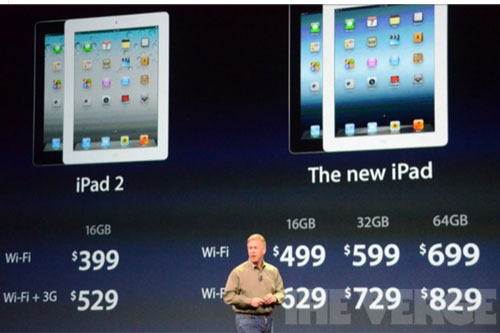 此次發(fā)布的新一代iPad分別為WiFi版16G/32G/64G,價格分別為499美元/599美元/699美元。同時蘋果新一代iPad還發(fā)布了LTE版本,同時向下支持HSPA+網(wǎng)絡(luò),其中16G/32G/64G,價格分別為629美元/729美元/829美元。