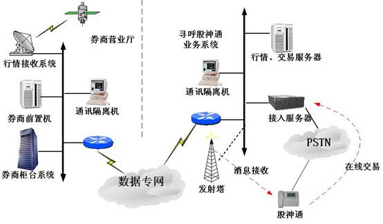 最終我們的設(shè)想是類(lèi)似于呼叫中心的外包方式,由尋呼臺(tái)建立一套短訊接入系統(tǒng),并與券商的交易系統(tǒng)聯(lián)網(wǎng)(通過(guò)交易前置機(jī)),各券商租用部分資源,同時(shí)給他們的股民提供股神通話(huà)機(jī),股民們一方面可通過(guò)尋呼臺(tái)的無(wú)線(xiàn)資源接收股市信息,另一方面可以通過(guò)電話(huà)線(xiàn)接入尋呼的交易系統(tǒng)進(jìn)行交易。