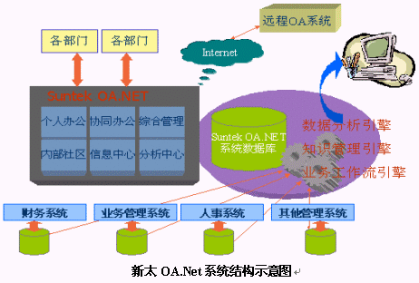 新太OA.NET系統(tǒng)采用B/S結(jié)構(gòu)設(shè)計,系統(tǒng)以提供大量快速靈活的自定義功能以及許多核心平臺產(chǎn)品,如協(xié)同工作平臺、通訊平臺、知識管理平臺、信息服務(wù)平臺等,能夠幫助用戶快速實(shí)施信息化建設(shè),OA.NET系統(tǒng)的最大特色是實(shí)現(xiàn)"零代碼"維護(hù)功能,系統(tǒng)安裝后,無需編寫任何代碼就可生成各種辦公業(yè)務(wù)應(yīng)用,用戶只需幾個小時的培訓(xùn)就可以使用OA.Net提供的工具進(jìn)行復(fù)雜辦公流程的設(shè)計,并且可以不需要經(jīng)過任何編碼的改動,就能輕松適應(yīng)流程變化的新情況。另外,OA.NET強(qiáng)調(diào)對企業(yè)內(nèi)部知識的有效管理和有效利用,能夠沉積企業(yè)日常的零散信息,并通過有序歸類的方式使之成為對企業(yè)有用的知識。OA.Net還提供了功能強(qiáng)大的個性化配置功能,每個員工都可以定制自己的界面風(fēng)格和功能模塊,并且可以自己建立個人的應(yīng)用環(huán)境,滿足個人的喜好。OA.Net包含了新太自主開發(fā)的業(yè)務(wù)工作流處理引擎,能夠在不用編寫代碼的情況集成其他業(yè)務(wù)系統(tǒng),實(shí)現(xiàn)了業(yè)務(wù)系統(tǒng)中的數(shù)據(jù)和辦公流程的完美結(jié)合,使得辦公應(yīng)用系統(tǒng)真正成為企業(yè)內(nèi)部的廣義化辦公門戶。