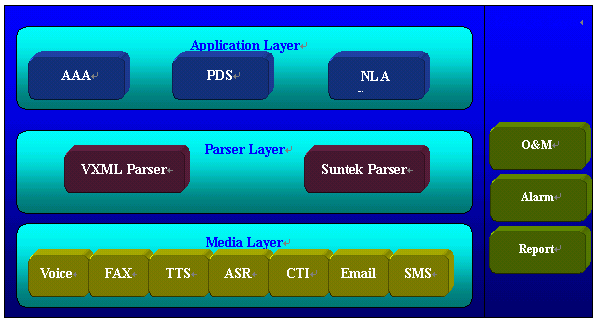 面向快速集成開發(fā),靈活開放、堅如磐石,可擴(kuò)展性極強。它廣泛支持各類主流交換機和CTI中間件,提供了自動語音,傳真收發(fā),大規(guī)模會議,TTS/ASR,VXML,支持直接對外部數(shù)據(jù)操作和DLL調(diào)用等領(lǐng)先功能。Ssurnon-IVR已經(jīng)在國內(nèi)絕大多數(shù)語音增值運營商在線運行,例如,TOM.COM公司采用新太I(xiàn)VR系統(tǒng),憑借快速的新業(yè)務(wù)開發(fā)和強大的功能,業(yè)務(wù)發(fā)展非常迅速,三個月后語音增值營業(yè)收入達(dá)到每月數(shù)百萬元。