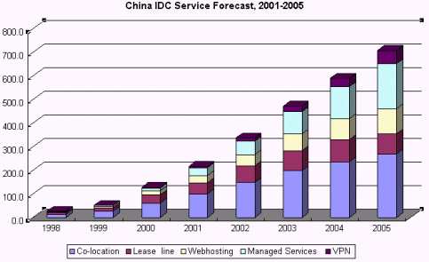 Frost & Sullivan研究表明,在2000年,中國IDC市場規(guī)模約為1億2千萬美圓,預(yù)測到2005年,將達到7億美圓。從2000年到2005年間,中國IDC市場的年平均復(fù)合增長率將達42.3% 。