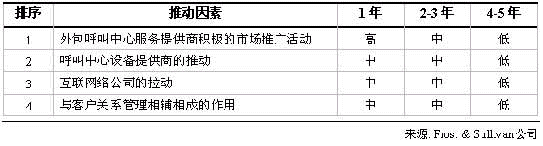 表二羅列了推動中國外包呼叫中心服務市場發(fā)展的主要因素。