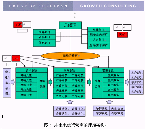 Frost & Sullivan(中國)公司深入研究國際主流運(yùn)營商的組織結(jié)構(gòu)與管理模式,同時(shí)參考了國際上公認(rèn)的eTOM模型,并結(jié)合國內(nèi)電信運(yùn)營商組織結(jié)構(gòu)的現(xiàn)狀,提出了圖1所示的未來電信運(yùn)營商的理想架構(gòu)。理想架構(gòu)的確定對電信運(yùn)營管理的變革具有重要的意義。只有事先明確了方向,并且對未來達(dá)成了廣泛一致的共識,才能對目標(biāo)過程進(jìn)行分解,有步驟、有方法、有成效的完成目標(biāo)。