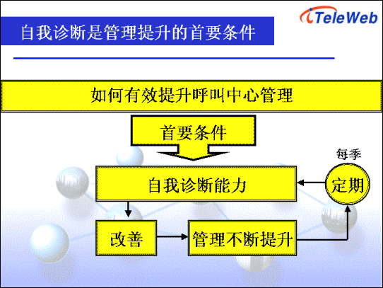 在如何提升呼叫中心運營管理中,自我診斷是首要步驟。通過對現(xiàn)有管理流程的診斷,找出需要改進的項目以及空間,從而評估與呼叫中心整體營運目標是否相符。同時透過與整體組織架構,同業(yè)比較以及標準基準,即可找出需要改進的地方。