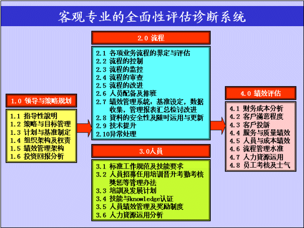 此評估診斷系統(tǒng)以1.0領導與決策規(guī)劃為起始點,作為建立一個以客戶為核心的高質(zhì)量客戶服務中心的推動根源,并且制定了一個良好的4.0績效評估系統(tǒng),以確保經(jīng)營目標與標準質(zhì)量基準能確實達成,此過程需透過嚴謹?shù)牧鞒淘O計和高效的人員管理去執(zhí)行這套運營體系。
