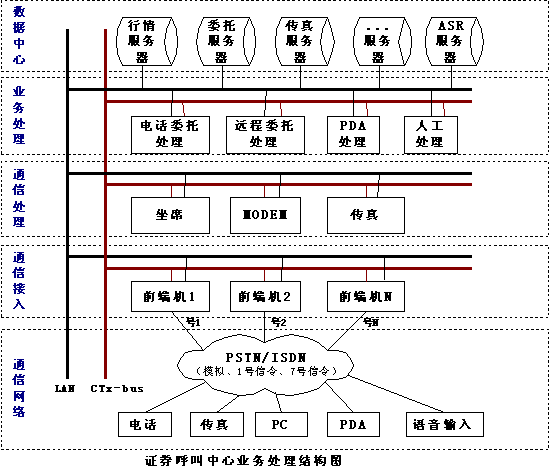 另一種方案是PDA和證券營業(yè)部前端機(實際就是電話委托前端機)采用FSK通訊方式,使用電話委托的通道來完成所有的委托查詢。這種方式的速度快,信息容量大,保密性強,而且營業(yè)部不需單獨申請電話線路,PDA和電話委托線路可動態(tài)分配,使其電話線路得到最大限度的利用。另外,營業(yè)部對外形象也好,只用一個號碼就可讓股民完成電話委托、PDA委托等多種委托方式,給股民帶來了方便。不過這種方式需要得到電話語音卡提供廠商的產(chǎn)品技術(shù)支持,語音卡必須同時支持標準的DTMF和FSK的方式,卡上有充足的能力來處理兩種方式,在語音處理卡的底層驅(qū)動應該將電話和PDA的委托區(qū)別開來,目前市場能夠完全支持這種應用的只有深圳市東進通訊技術(shù)股份有限公司的產(chǎn)品,東進技術(shù)的新一代PCI系列語音卡數(shù)字卡和模擬卡都完全采用DSP(數(shù)字信號處理器)架構(gòu),卡上有專用DSP來處理DTMF和FSK的收發(fā),是目前PDA委托前端的最好選擇;這種方案還應該得到證券電話委托系統(tǒng)的開發(fā)商的支持,在電話委托系統(tǒng)里增加處理PDA委托的功能。目前恒基偉業(yè)的“股靈通”就是采用這種方式。