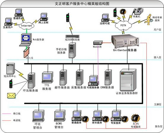 泰陽證券有客戶2萬多,相當(dāng)一部分要通過電話委托程序作交易。原有電話委托系統(tǒng)是模擬線。交易忙時(shí),很多股民打不進(jìn)去。以前的業(yè)務(wù)相對也比較簡單。文正明公司在了解了泰陽方面的業(yè)務(wù)需要后,用公司的UniCenter系統(tǒng)和深圳東進(jìn)公司的ISDN數(shù)字卡、傳真卡和座席卡,為泰陽搭建了一個(gè)新的語音應(yīng)用平臺。