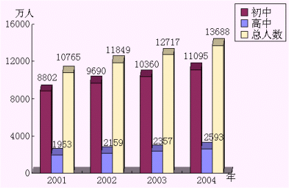 2001年,中國大陸中學(xué)學(xué)生人數(shù)已達(dá)10765萬人,而且學(xué)生人數(shù)還在快速增長。初中學(xué)生人數(shù)以每年6.5%的速度增長,普通高中學(xué)生人數(shù)也以每年10%-11%的速度增長?梢钥闯觯逃袌鼍薮蟮臐摿蜕虣C(jī)。