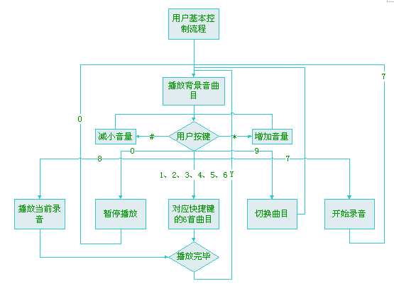 用戶設(shè)定:用戶可以通過語音自動(dòng)導(dǎo)航或者通過上網(wǎng)來自主選擇并設(shè)定背景音效,并把其中最常用的六種音效對(duì)應(yīng)1~6號(hào)按鍵,這樣用戶在自己使用的過程中就可以根據(jù)當(dāng)時(shí)的情況使用自己喜歡的背景音效了。