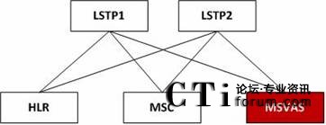 MSVAS平臺可以通過七號信令網與移動核心網中的各個網元進行對接,如與七號信令網中的LSTP進行對接,通過ISUP、TUP以及MAP對核心網中HLR、MSC、短信中心等網元進行訪問,實現移動管理(位置查詢)、呼叫處理(主要是獲取路由信息)、業(yè)務登記、短消息業(yè)務等功能,其連接方式如下圖所示: