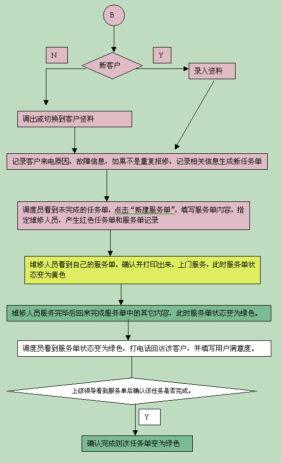 如果是需要上門維修的客戶,點擊"新建任務單",填寫任務單上的相關(guān)內(nèi)容,此時任務單狀態(tài)為紅色;調(diào)度員看到新任務單,點擊"新建服務單",填寫服務單內(nèi)容,指定維修人員。此時任務單狀態(tài)變?yōu)榧t色,服務單狀態(tài)則為紅色。維修人員看到自己的服務單,確認并打印出來,上門服務,此時服務單狀態(tài)變?yōu)辄S色;維修人員服務完畢后回來完成服務單中的其它內(nèi)容,此時服務單狀態(tài)變?yōu)樗{色;調(diào)度員看到服務單狀態(tài)變?yōu)樗{色,打電話回訪該客戶,并填寫用戶滿意度;上級領(lǐng)導看到服務單后確認該任務是否完成。確認完成則該任務單變?yōu)樗{色,否則再派出一張服務單。直到任務完成。