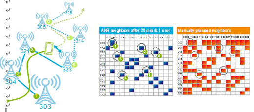 ANR盡管目前在LTE還沒有商用,但在多個歐美運營商的測試中,愛立信產(chǎn)品表現(xiàn)良好。如下圖ANR測試中,僅使用一個移動終端在20分鐘內(nèi)通過了20個基站覆蓋區(qū)域,檢測到的鄰區(qū)關(guān)系如藍圖所示,相比橙色圖的手工配置鄰區(qū),所有必要的鄰區(qū)關(guān)系(有數(shù)字標示)悉數(shù)獲得。而且這僅僅動用了一個終端,如果相關(guān)區(qū)域內(nèi)都有終端分布,檢測的速度會有極大提高。