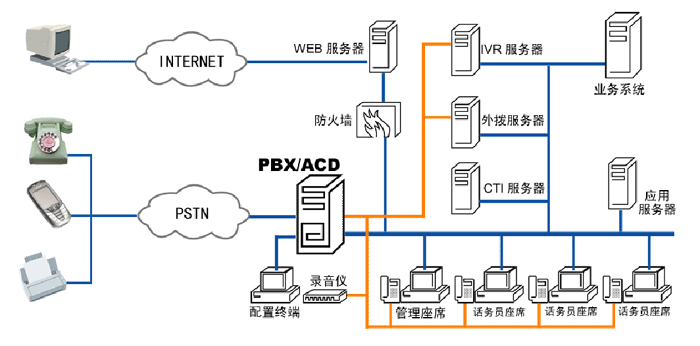 客戶服務(wù)中心可以形象的理解為客戶關(guān)懷中心、客戶聯(lián)系中心、電話服務(wù)中心、客戶支持中心、服務(wù)熱線等。從技術(shù)的角度看,客戶服務(wù)中心是一組座席員集中進(jìn)行來(lái)電處理和發(fā)出呼叫與客戶聯(lián)系的專門(mén)的系統(tǒng)。呼叫中心系統(tǒng)結(jié)構(gòu)為: