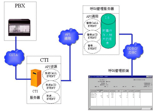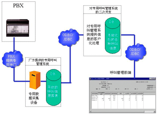 一般來說,各大有能力推出PBX產(chǎn)品的通訊廠商都有自己專用的呼叫管理系統(tǒng)。這些專用的呼叫管理系統(tǒng)可以直接從PBX獲取最高效的消息,而不用通過CTI SERVER。當(dāng)然,這些專用的呼叫管理系統(tǒng)也只能應(yīng)用于專門的PBX產(chǎn)品。 如果運營商在選購設(shè)備的時候,已經(jīng)選購了專用的呼叫管理系統(tǒng),那么開發(fā)商可以對這個專門的呼叫管理系統(tǒng)進(jìn)行二次開發(fā)。請看下面的數(shù)據(jù)流程圖: