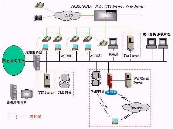 · 一個完整的呼叫中心解決方案通常由以下核心部分組成:自動呼叫分配(ACD)、交互式語音應答(IVR)、計算機電話綜合應用(CTI)、錄音服務器、呼叫管理(CMS)等。