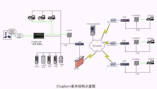硬件:中心點(diǎn)有ZingSwitch®,O口網(wǎng)關(guān)和內(nèi)線卡,VPN動態(tài)注冊服務(wù)器和VPN設(shè)備,或GK服務(wù)器。座席端配置S口網(wǎng)關(guān),根據(jù)需求配置相應(yīng)的VPN設(shè)備。