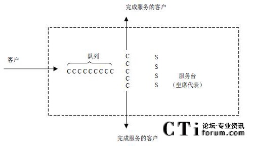 呼叫中心是一個典型的排隊(duì)系統(tǒng)。電話一個接著一個到來,接受各種服務(wù)。如果一個到達(dá)的客戶不能立即接受服務(wù),這個客戶就加入到一個隊(duì)列中進(jìn)行等待,圖示是一個單隊(duì)列的排隊(duì)模型,如果呼叫中心擁有多個隊(duì)列,則需要構(gòu)造多個上述的排隊(duì)模型。