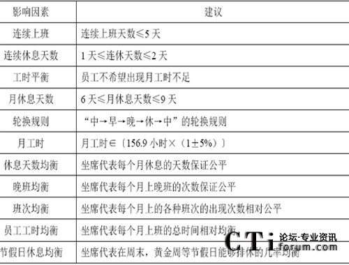 要滿足每半小時實(shí)際安排的座席數(shù)量不少于需要的座席數(shù)量的要求,首先就需要進(jìn)行班次的設(shè)計(jì),這是為第五環(huán)節(jié)資源規(guī)劃而準(zhǔn)備的。“班次設(shè)計(jì)”是指設(shè)計(jì)出一系列的班次,比如早班,中班,晚班,等等。而將來只要告訴員工,你下個月每天各上什么樣的班次即可。在班次設(shè)計(jì)時,需要充分考慮前面提到的一些影響因素:如下所示。