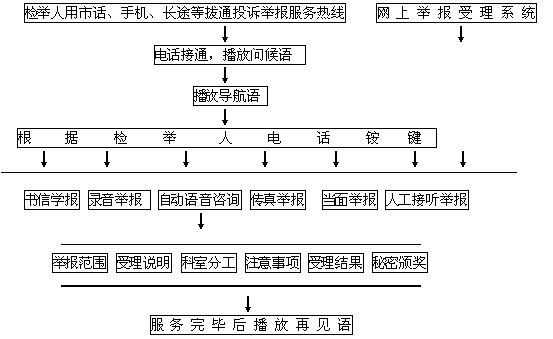 本系統(tǒng)充分借助計算機及通迅線路的優(yōu)勢,將高度普及的電話線路,同高科技的計算機處理緊密結(jié)合起來,通過電話語音這一人類最易溝通交流的途徑和手段,將檢舉人和檢察院緊密結(jié)合起來。檢舉人通過簡單的拔通服務電話,使用電話按鍵,利用自動語音導航和人工服務,實現(xiàn)以上熱線投訴舉報的自動咨詢及人工服務的各項功能。