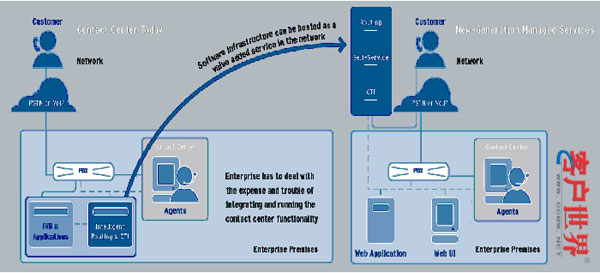 以國外的托管服務若建立在800號于C4/C5局用交換機上,許多用戶可以不用建制本地的排隊機就可以實現(xiàn)托管服務。目前國內(nèi)的運營商若要直接在C4/C5局用交換機因為沒有C4/C5的CTI服務器可以連接,所以有其困難的地方,只能采用800號智能網(wǎng)新增業(yè)務與本地企業(yè)排隊機連網(wǎng)的方式來完成。但國內(nèi)運營商未來都會朝向NGN,采用軟交換的方向來看,企業(yè)可能再也不用采購本地排隊機,對于呼叫中心托管的業(yè)務是一個很好的方向。