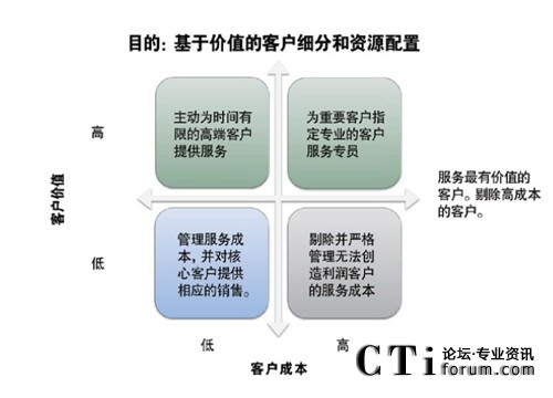 現(xiàn)實(shí)情況是,許多采取該策略的公司都僅將基于價值的客戶細(xì)分應(yīng)用于高價值、高成本的客戶,而不是應(yīng)用于已有客戶的絕大部分。這是一種不可持續(xù)的商業(yè)行為。然而,許多公司之所以這樣做,是因?yàn)楣驹谒械目蛻艏?xì)分領(lǐng)域,無視價值高低,不加區(qū)分的投入成本和服務(wù),會存在風(fēng)險,即讓服務(wù)更多的投入到價值不高,卻又經(jīng)常呼入的客戶上,從而忽視了一些更有