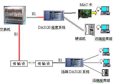 見下圖:DAS120主機(jī)通過4個E1接口與交換機(jī)直接連接,可方便地實(shí)現(xiàn)本地座席接入。遠(yuǎn)端分布式接入則需要通過傳輸設(shè)備,它們可為光纖,微波,HDSL等。終端可為座席卡和電話機(jī)。