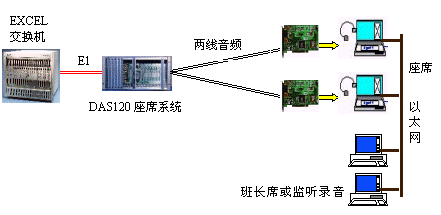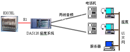 因?yàn)镋XCEL交換機(jī)不能提供模擬接口。DAS120的出現(xiàn)很好地彌補(bǔ)了其不足。它與EXCEL交換機(jī)采用4個E1連接,可以簡潔實(shí)現(xiàn)PCM信號轉(zhuǎn)模擬信號引出到座席。E1接口的信令可選配為隨路信令CAS和透明通道Clear