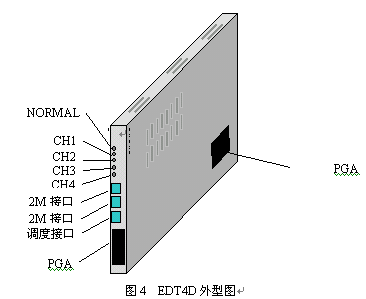 EDT4D是在舊EDT4板上增加調(diào)度接口。見圖4,EDT4D為一塊H20-20交換機(jī)插板,厚度為兩個槽口。EDT4通過扁平電纜與交換機(jī)公共控制機(jī)柜的背板PGA相連,提取交換機(jī)時隙;并將時隙轉(zhuǎn)換為由四個數(shù)字中繼接口E1組成的準(zhǔn)V5.2接口與遠(yuǎn)端模塊相連。一塊EDT4可接2個PGA端口組,共128個話路。