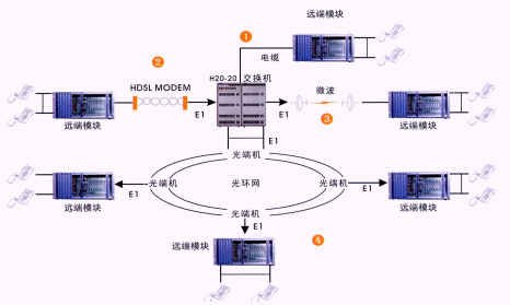 遠(yuǎn)端模塊通過標(biāo)準(zhǔn)2M(E1)接口與交換機(jī)連接。該接口不受傳輸距離和傳輸設(shè)備的限制。常用的傳輸設(shè)備有SDH、PDH光端機(jī)(光纜),數(shù)字微波、數(shù)字?jǐn)U頻,HDSL調(diào)制解調(diào)器(雙絞線)等。