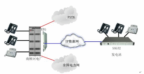 說明:南椏河電廠在現(xiàn)有的IP網(wǎng)絡(luò)基礎(chǔ)上,利用IP中繼網(wǎng)關(guān)EEG與SAG32電信級模擬VoIP網(wǎng)關(guān)實現(xiàn)交換機的遠程放號,實現(xiàn)了發(fā)電站與電廠、省電力網(wǎng)、電信等的組網(wǎng),解決了實際的通信問題。在方案中,具有組網(wǎng)簡單,維護方便,通話質(zhì)量高等特點,得到當(dāng)?shù)赜脩舻恼J可。