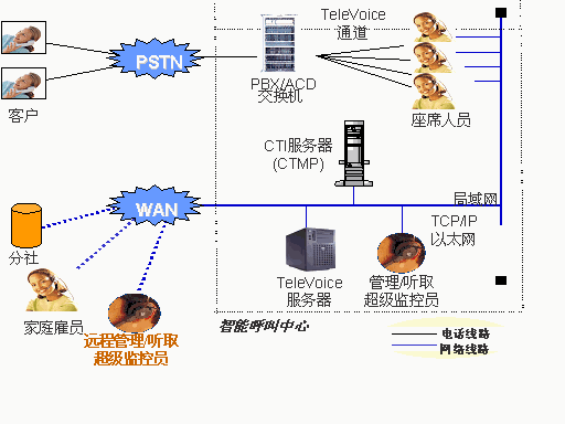 遠(yuǎn)程家庭辦公雇員支持:錄音裝備和家庭辦公雇員個人電腦之間,通過專用線、ADSL 或 ISDN 等, 甚至把在家進(jìn)行的通話內(nèi)容存放到總部的服務(wù)器中做錄音保存和控制