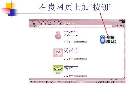 簡單地說,就是當(dāng)有客戶瀏覽到網(wǎng)上購物的網(wǎng)頁時(shí),若有任何疑問或想立即購買,只要點(diǎn)擊在網(wǎng)頁上的“按鈕”鍵,就可以直接接通到網(wǎng)站的客服中心,實(shí)現(xiàn)即時(shí)地語音互動(dòng)。也不需再像以前那樣發(fā)E-MAIL或撥電話號碼了。效果可謂是立竿見影。(如圖示)