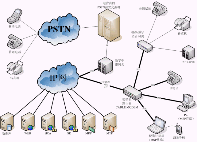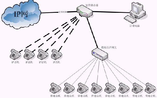 1、 數(shù)據(jù)線路直接連接IP話機、語音網(wǎng)關(guān)或安裝了軟電話(MSP)的PC或筆記本電腦,語音網(wǎng)關(guān)連接普通話機、傳真機或用戶端的PBX。