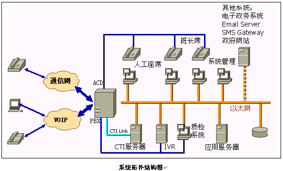 《政府呼叫中心系統(tǒng)》采用聲軟科技的《XCCP呼叫中心系統(tǒng)》平臺,主要由PBX交換機(jī)、CTI服務(wù)器、IVR系統(tǒng)、應(yīng)用服務(wù)器、數(shù)據(jù)庫服務(wù)器、TTS系統(tǒng)和座席系統(tǒng)等硬件設(shè)備和系統(tǒng)應(yīng)用軟件組成。它以電話服務(wù)為主要服務(wù)方式、結(jié)合計(jì)算機(jī)信息系統(tǒng)的資料數(shù)據(jù),為用戶提供全方位的服務(wù)。