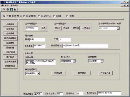 客戶服務中心系統(tǒng)將為鐵路局提供強勁的客戶關(guān)系管理能力,自動業(yè)務導航能力,交互式協(xié)作能力,并可通過基于各業(yè)務代表技能特點的路由選擇,將客戶來話接到最符合要求的業(yè)務代表處,對于老客戶還可以建立一對一的關(guān)系,將老客戶的來話直接接到以前曾與之通過話的業(yè)務人員處,使其倍感親切。同時,高度集中的客戶服務中心可以使鐵路部門用最低成本向旅客、貨主提供最有保證的服務和支持,不論在商機管理、客戶服務、還是顧客群維系等諸多方面,都是客戶服務中心發(fā)揮其巨大作用的領域。鐵路部門充分利用客戶服務中心的優(yōu)勢,可以帶來無限商機,通過電話回訪等手段,既能樹立良好的企業(yè)形象,又能提供完善的服務。這樣對增強客戶忠誠度,保持原有的客戶群,降低顧客流失率和擴大新的顧客群都將起到很好地作用。