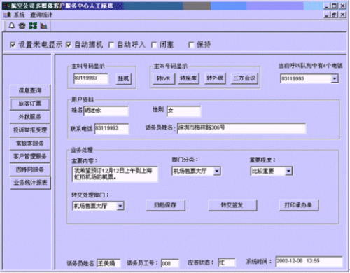 。。客戶打入電話后,當(dāng)系統(tǒng)的自動語音應(yīng)答子系統(tǒng)無法解決客戶問題時,客戶可選擇人工服務(wù),由航空公司客戶服務(wù)代表直接接聽客戶電話,處理并解決客戶問題。此時客戶同座席話務(wù)人員直接溝通,并同時記錄下該客戶的聯(lián)系方式,將相關(guān)數(shù)據(jù)添加入系統(tǒng)數(shù)據(jù)庫;也可以在數(shù)據(jù)庫的支持下回答機場航班/航空貨運信息及相關(guān)規(guī)定等的咨詢和疑問、訂座/訂艙?蛻粢部梢赃x擇自動語音服務(wù)方式,根據(jù)系統(tǒng)的語音提示輸入按鍵,選擇類別,將自己的投訴和建議以及自己的聯(lián)系方式信息以留言錄音的方式保存在系統(tǒng)中。系統(tǒng)同時還支持自動傳真方式,客戶可以通過傳真機進入本系統(tǒng),通過按鍵選擇傳真方式,將自己的意見建議等的文本內(nèi)容傳真給系統(tǒng),系統(tǒng)自動接受并存入數(shù)據(jù)庫。
