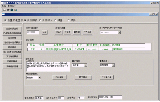- 提高企業(yè)親切感:系統(tǒng)在人工服務(wù)狀態(tài)下,當(dāng)業(yè)務(wù)代表輸入客戶名稱時(shí),系統(tǒng)即時(shí)將客戶與企業(yè)相關(guān)的信息顯示在座席終端上,使業(yè)務(wù)及時(shí)了解客戶,有針對(duì)性回答客戶問(wèn)題,使客戶倍感親切。