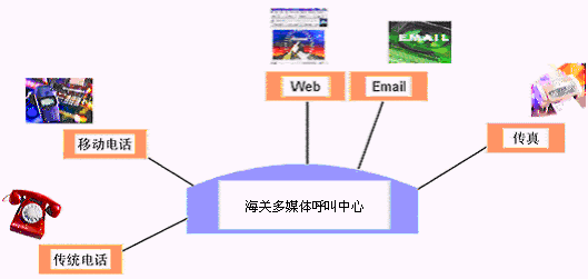 客戶利用電話、傳真、電子郵件、因特網(wǎng)、手機等撥打某一特服號碼(如9xxxx)進入海關多媒體呼叫中心系統(tǒng),本系統(tǒng)依托海關緝私相關的MIS系統(tǒng)、OA度系統(tǒng)等各類業(yè)務技術支持系統(tǒng)和網(wǎng)絡系統(tǒng),通過自動語音服務或人工受理等方式全天24小時不間斷地為客戶提供各種服務。