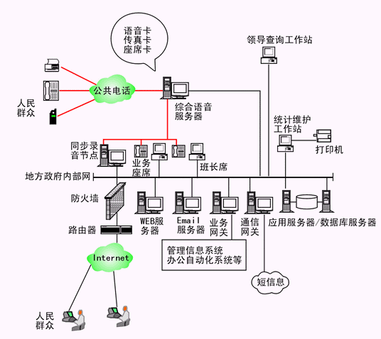 本系統(tǒng)物理結(jié)構(gòu)由帶語音板卡的工控機(jī)或排隊(duì)交換機(jī)、座席分流器、CTI服務(wù)器、IVR(交互式語音應(yīng)答)/IFR(交互式傳真應(yīng)答)服務(wù)器、業(yè)務(wù)代表座席、班長座席、統(tǒng)計(jì)維護(hù)管理工作站、因特網(wǎng)(WEB)服務(wù)器、電子郵件(EMAIL)服務(wù)器、數(shù)據(jù)庫/應(yīng)用服務(wù)器、業(yè)務(wù)網(wǎng)關(guān)服務(wù)器、錄音留言工作站、領(lǐng)導(dǎo)查詢工作站、網(wǎng)絡(luò)系統(tǒng)等構(gòu)成。