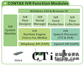 CONTAX IVR 是一個(gè)完整的媒體交換方案,可用于交互式語(yǔ)音應(yīng)答、文字/語(yǔ)音轉(zhuǎn)換、電腦電話語(yǔ)音整合、傳真轉(zhuǎn)遞、自動(dòng)傳真回覆 (FOD)、簡(jiǎn)訊發(fā)送等等……