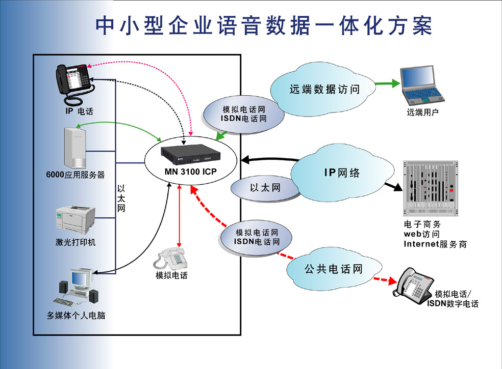 商務(wù)電話系統(tǒng)、本地網(wǎng)和網(wǎng)關(guān)集成在統(tǒng)一的平臺上?敏迪網(wǎng)絡(luò)推出的MN3100綜合通信平臺就是這樣簡單快捷的滿足您的需要,它是專為小型企業(yè)或大型企業(yè)的分支機(jī)構(gòu)而設(shè)計的語音數(shù)據(jù)集成的解決方案。