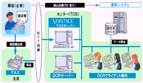 系統(tǒng)結(jié)構(gòu)中心每天收到FAX7~800張?蛻(hù)數(shù)約 1,400家。系統(tǒng)配置是有VOISTAGE(VS-403MC)功能的FAX服務(wù)器和OCR