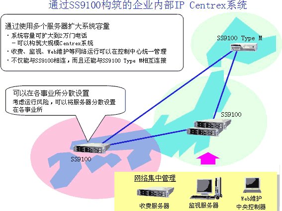 多個SS9100服務(wù)器相互協(xié)作,擴大了系統(tǒng)整體容量。以往模型由1個服務(wù)器構(gòu)成,系統(tǒng)最大只能容納5千門電話,而SS9100 R5可以構(gòu)筑將系統(tǒng)整體容量擴展到容納2萬門電話的大規(guī)模Centrex系統(tǒng)。進而,通過將服務(wù)器分散設(shè)置在各事業(yè)所的形式,可以考慮分散各事業(yè)所之間故障危險的基礎(chǔ)上構(gòu)筑系統(tǒng)。