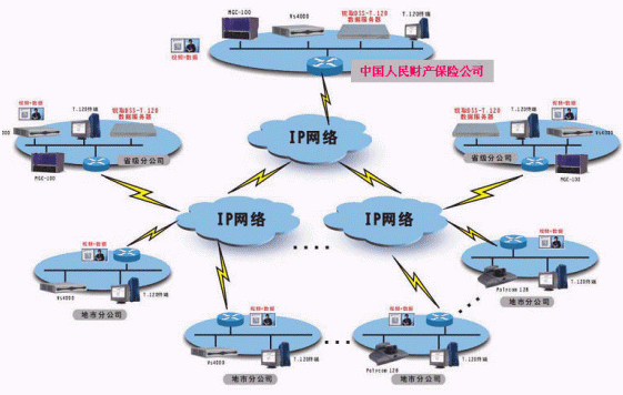 中國人民財產(chǎn)保險股份有限公司,是中國內(nèi)地最大的非壽險公司,香港證交所上市公司。經(jīng)過50多年的發(fā)展,中國人保財險公司已經(jīng)發(fā)展成為網(wǎng)點遍布全國31個省市區(qū),共有營業(yè)機構(gòu)4000余個的大型商業(yè)公司。為提高辦公效率,降低差旅成本,中國人保財險公司決定建設(shè)覆蓋從總公司、省分公司到地市分公司的視頻會議系統(tǒng),項目總?cè)萘窟_(dá)600多個節(jié)點,采用兩級級連方式組網(wǎng),要求系統(tǒng)具備視頻、音頻、數(shù)據(jù)交互功能,。