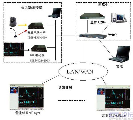 在分析了華安證券的實(shí)際需求和網(wǎng)絡(luò)環(huán)境以后,決定采用一套DSS-R-C20+來組建整個(gè)流媒體系統(tǒng)。系統(tǒng)由媒體采集系統(tǒng)視音頻編碼器(DSS-ENC-100)/VGA編碼器(DSS-ENC-100),流媒體處理和錄制系統(tǒng)(C20+)和客戶端RecPlayer組成。通過此系統(tǒng)可以實(shí)現(xiàn)語音、視頻和計(jì)算機(jī)桌面的同步實(shí)時(shí)直播、錄制和點(diǎn)播。系統(tǒng)的結(jié)構(gòu)圖如下: