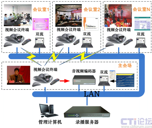 當(dāng)需要錄制沒有錄播的其他會議室實(shí)況時(shí),通過主會場視頻會議終端呼叫任意會場的終端,即可錄制任意會場的會議實(shí)況,如下圖: