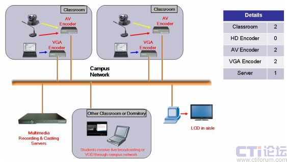 如上圖所示,服務(wù)器型號(hào)為DSS-R-T2,T系列的產(chǎn)品是銳取公司專(zhuān)門(mén)應(yīng)用于教育行業(yè)的產(chǎn)品。T2可支持兩個(gè)教室的同時(shí)錄制與直播,放置在學(xué)校數(shù)據(jù)中心的機(jī)房中。兩個(gè)AV Encoder和兩個(gè)VGA Encoder分別放置在需要做錄制直播的教室中。學(xué)生通過(guò)校園網(wǎng)或者Internet連接到服務(wù)器即可收看多媒體教學(xué)的直播,包括老師的圖像聲音以及講解的課件內(nèi)容。在教學(xué)樓中,每一層的走廊里都安裝了大的LCD顯示屏,服務(wù)器上的多媒體內(nèi)容也將同時(shí)傳到這些顯示屏上。